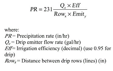 This calculator uses this equation to determine the Application Rate of a drip line irrigation system.