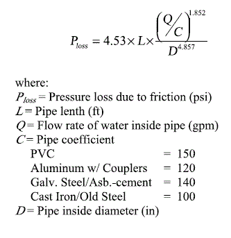 This is multiplied by the pressure loss (F X Ploss), where pressure loss is calculated by the Hazen-Williams formula: