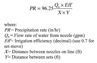 Use this first form to determine the effective application rate of sprinklers spaced at uniform distances from each other. This is particularly applicable to hand-move, or wheel-line, irrigation systems. The pressure is measured at the sprinkler nozzle. The head spacing is the distance between sprinkler heads along the water line, and the line spacing is the distance between lines in the field. If there is just one line being moved and the spray patterns overlay, as is typical for hand-move or wheel-line, then the actual application rate will be lower but the given number will be useful to determine set times. Learn more about the units used on this page.