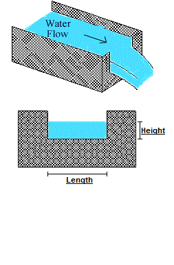 This calculates the water flow rate over a rectangular contracted weir. This weir has a rectangular opening where the sides are straight up and down. A contracted weir means that the ditch or canal leading up to the weir is wider than the weir opening itself. The water before the weir should be held in a relatively calm and smooth pool. There should be air (not trapped) underneath the water leaving the weir. The Length is the bottom width of the weir. The height is measured from the bottom of the weir opening to the top of the water level ponded behind the weir (not the water level right as it leaves the weir). Learn more about the units used on this page.